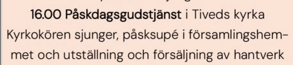 Kl. 16-17 är det gudstjänst i kyrkan, och därefter en enkel påskmåltid i församlingshemmet. Då finns det också möjlighet att se konstverken.